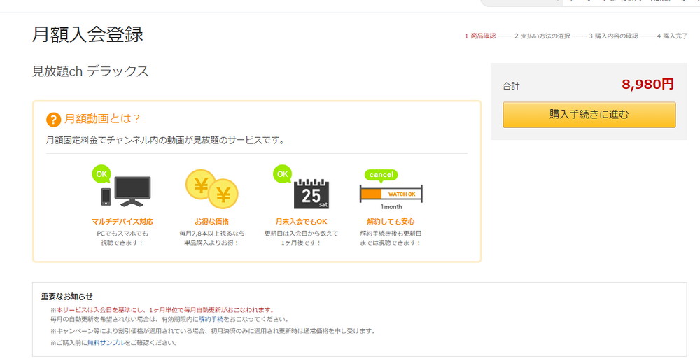 月額入会登録の画面に切り替わり、月額動画の紹介と料金が表示されます。