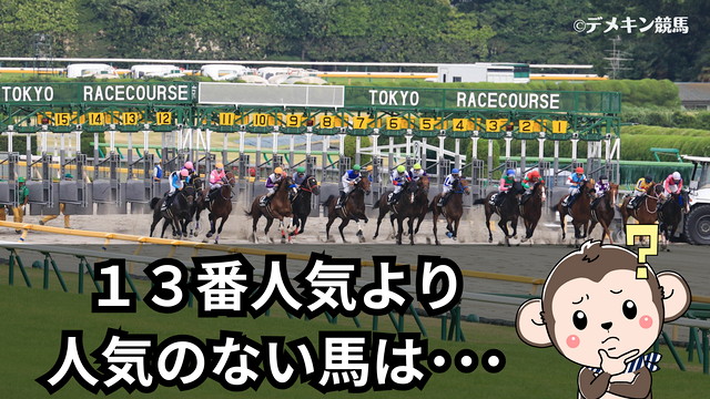 13番人気以下に関しては、そもそも買い目に入れていない方も多いと思うので、参考にもならないと思いますが、デメキンのルールでは出走頭数が16頭以上のレースでは13番人気以下(人気がない)馬は、無条件に買い目から外しています。