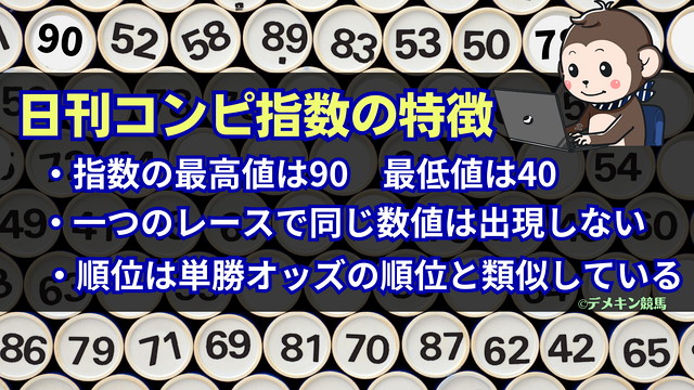 日刊コンピとは、日刊スポーツ新聞社が開発し、日刊スポーツ(新聞)では競馬開催日当日に、『極ウマ・プレミアム』では、前日から確認できる競馬予想の指数です。