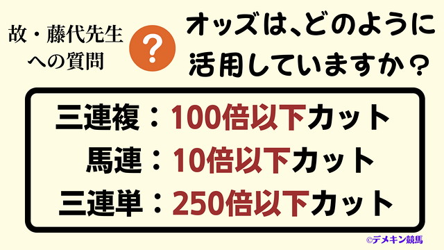 オッズを見て、三連複のときは100倍以下をカットする。馬連の場合は10倍以下はカット、ついでに三連単でいえば250倍以下はカット。