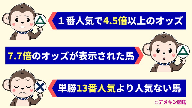 7.7倍という数値を見ると、「ラッキーかな」と思ってしまいたくなるところですが、デメキンの中で、オッズが7.7倍の馬は圏外に飛びやすいので、軸馬にはしません。