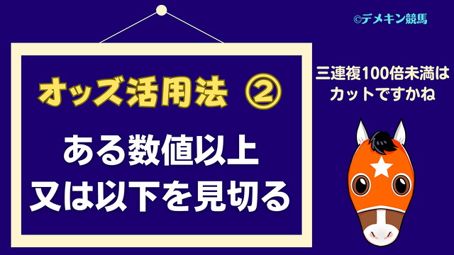 馬券を効果的に買うためのオッズ活用法予想法、二つ目は、ある数値以上又は以下を見切る、です。