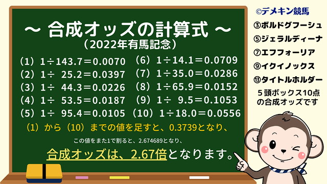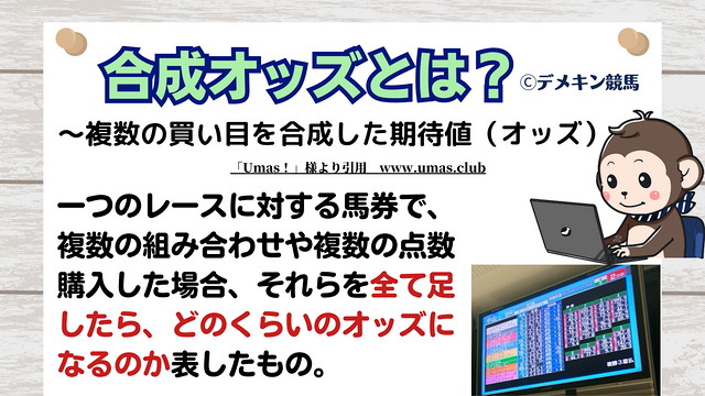 合成オッズとは、一つのレースで買う馬券において、複数の組み合わせや複数の点数を購入した場合、それらを全て足したら、どのくらいのオッズになるのか表したものです。