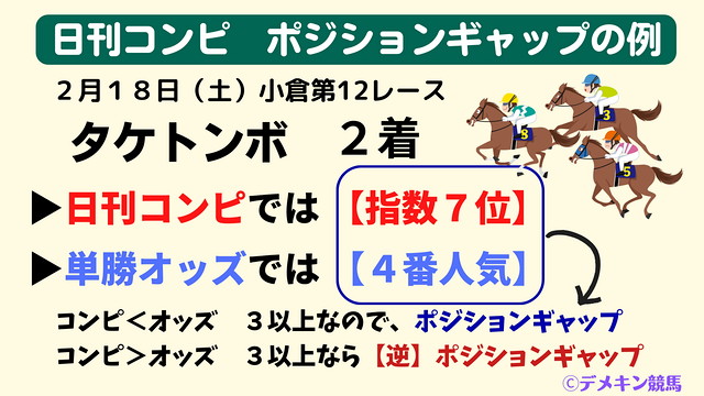例えば、日刊コンピでは6位、単勝オッズでは3人気の場合は、日刊コンピの順位<単勝オッズの順位、かつ3以上の開きがあるので、ポジションギャップとなります。